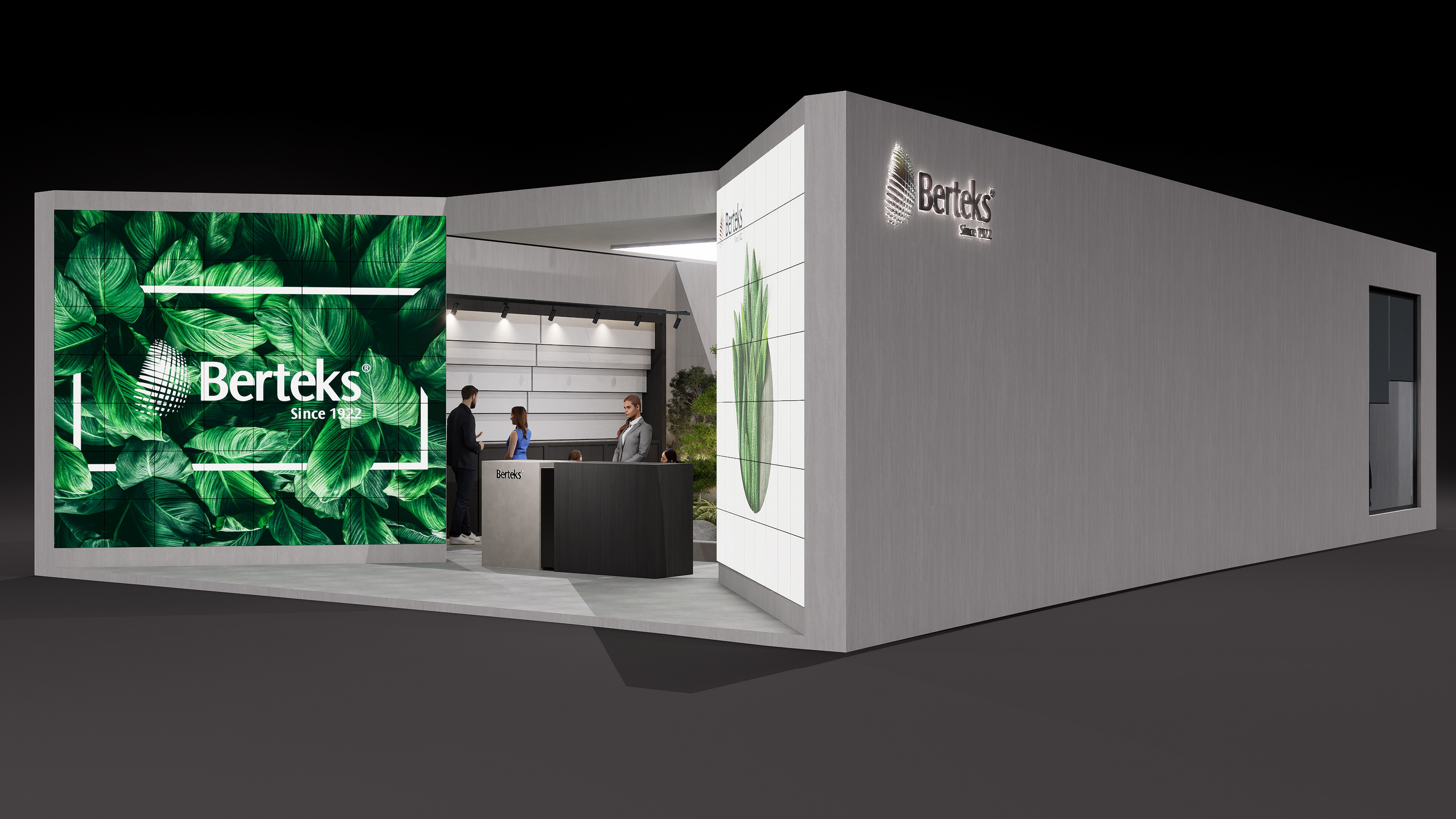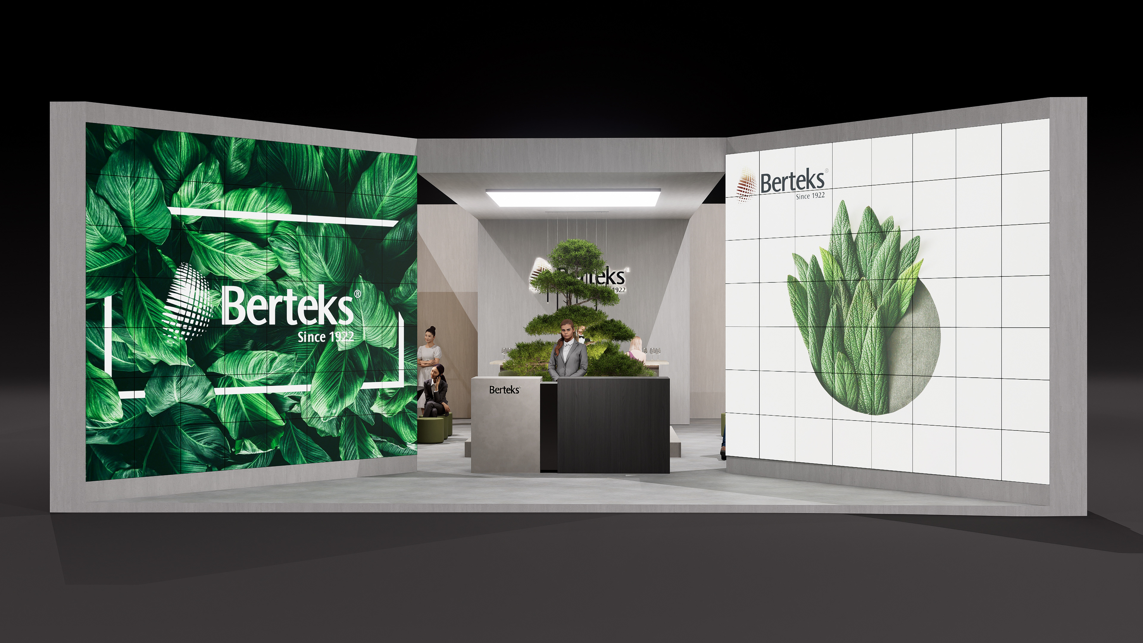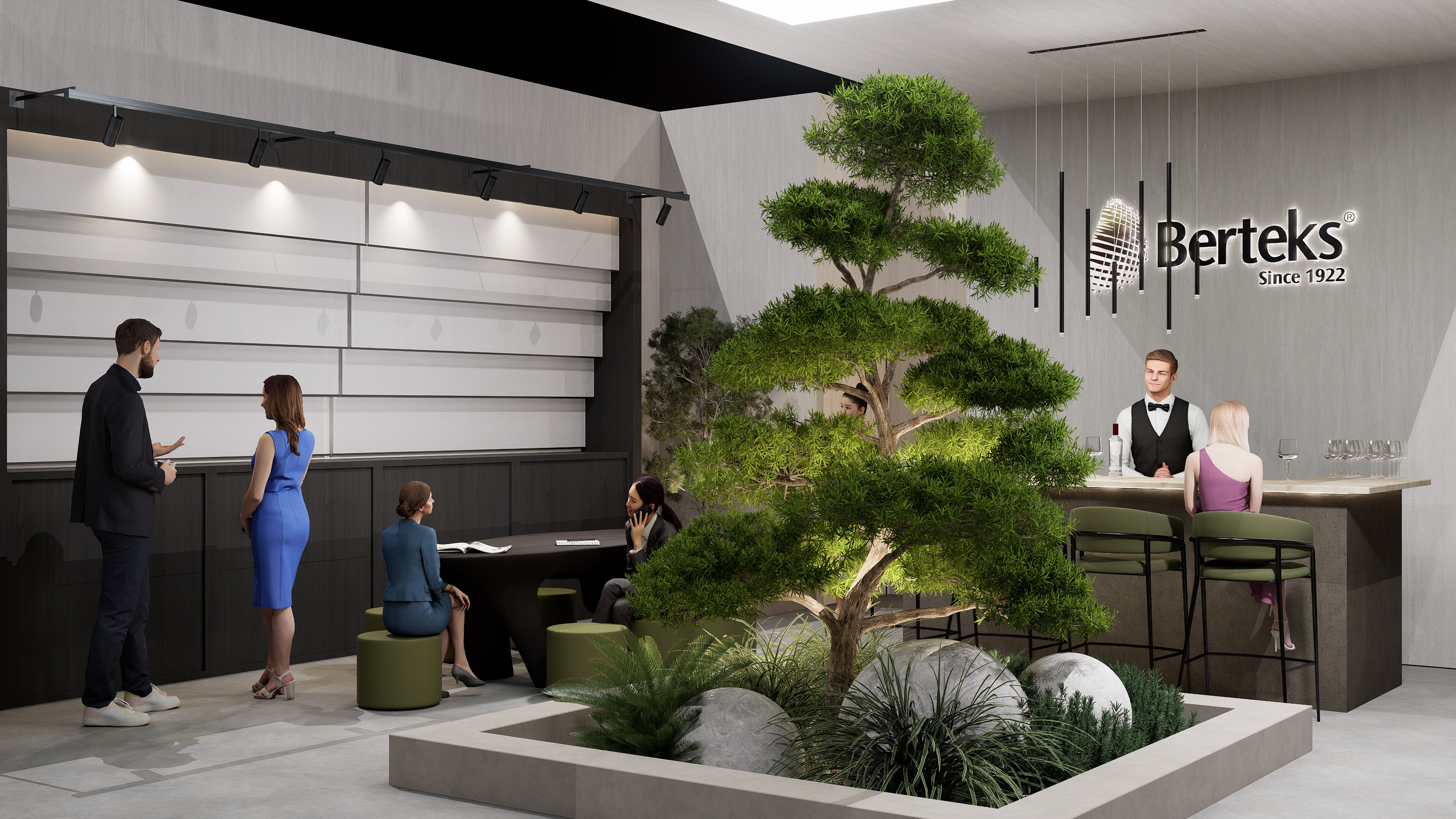 Stone, earth-toned, and matte concrete textures used on the floor and surfaces bring a sense of natural warmth and a timeless character to the stand. Matte finishes combined with varying shades of green and a soft natural lighting effect create a calm, peaceful, and inviting atmosphere. Dark wooden tabletops introduce warmth and elegance, while green-toned upholstery in the seating areas reflects nature’s color palette.
