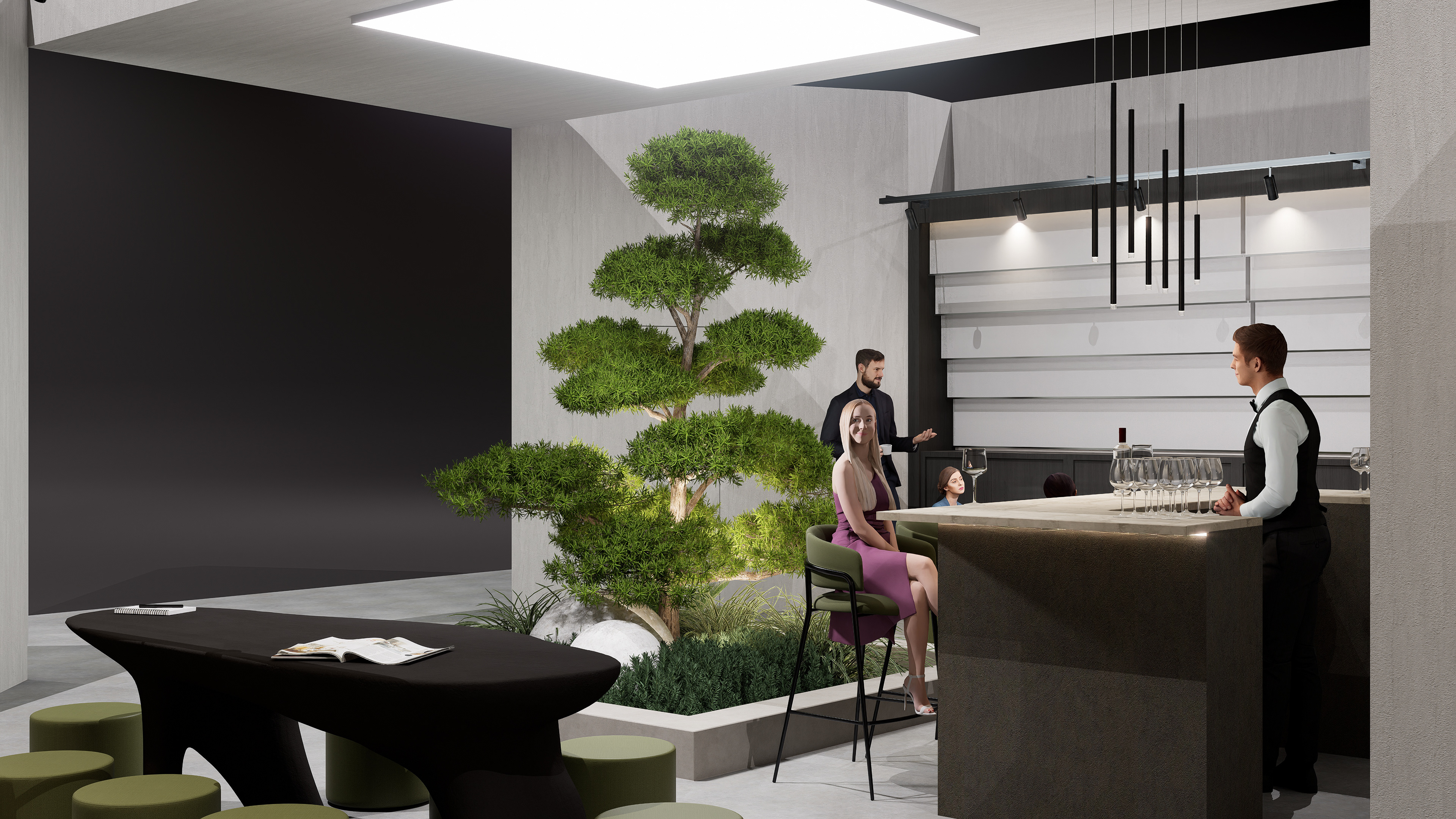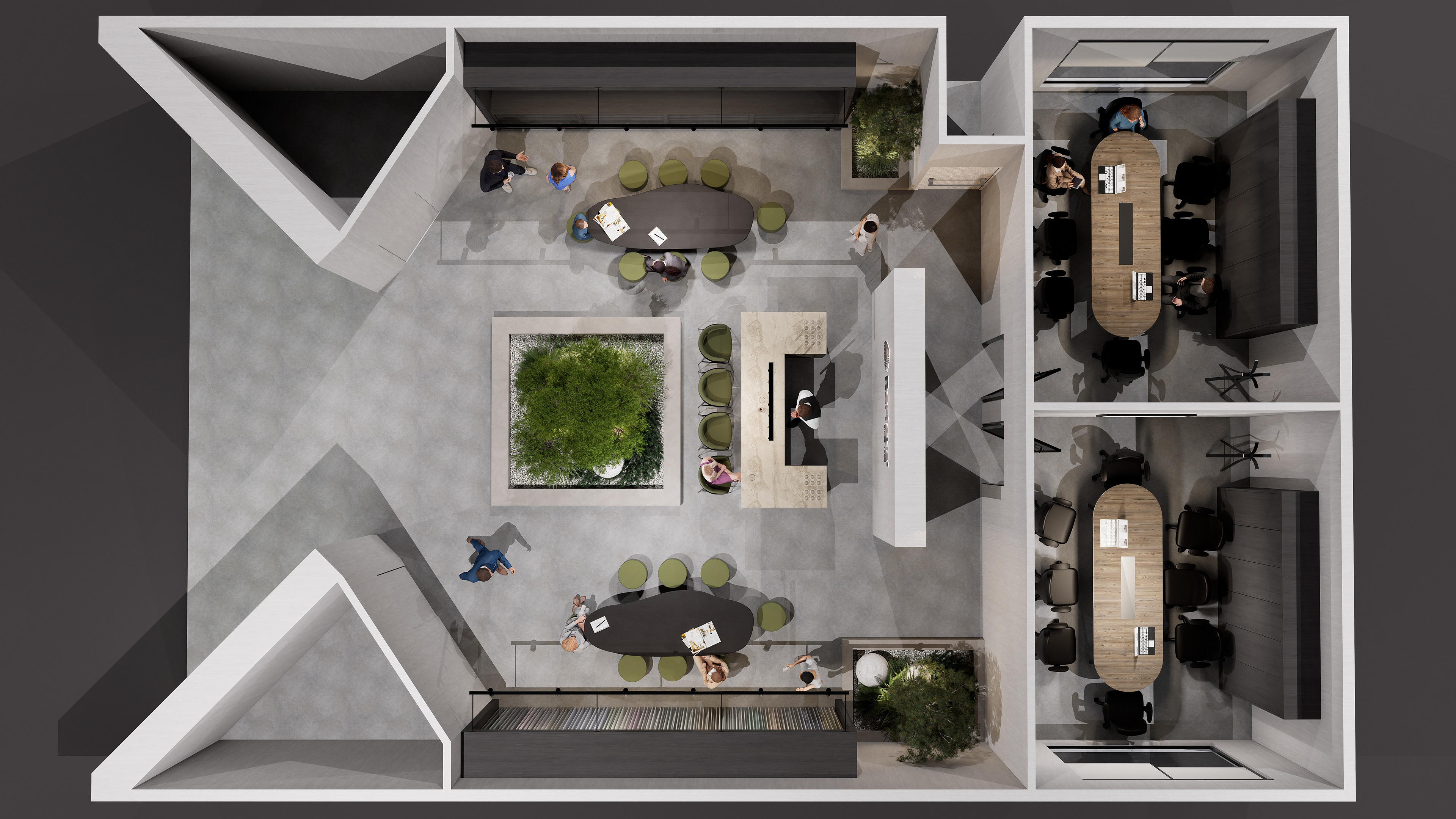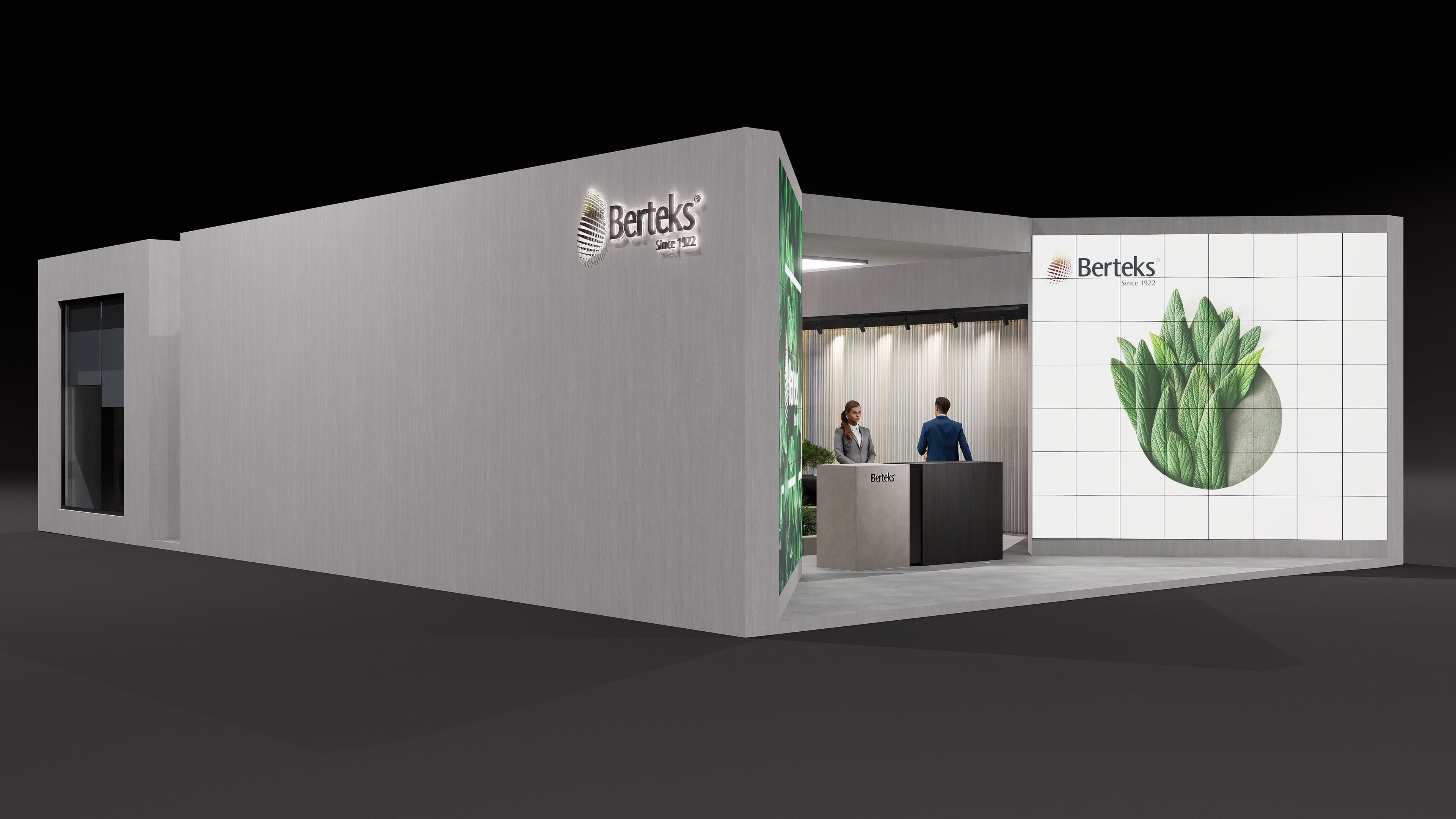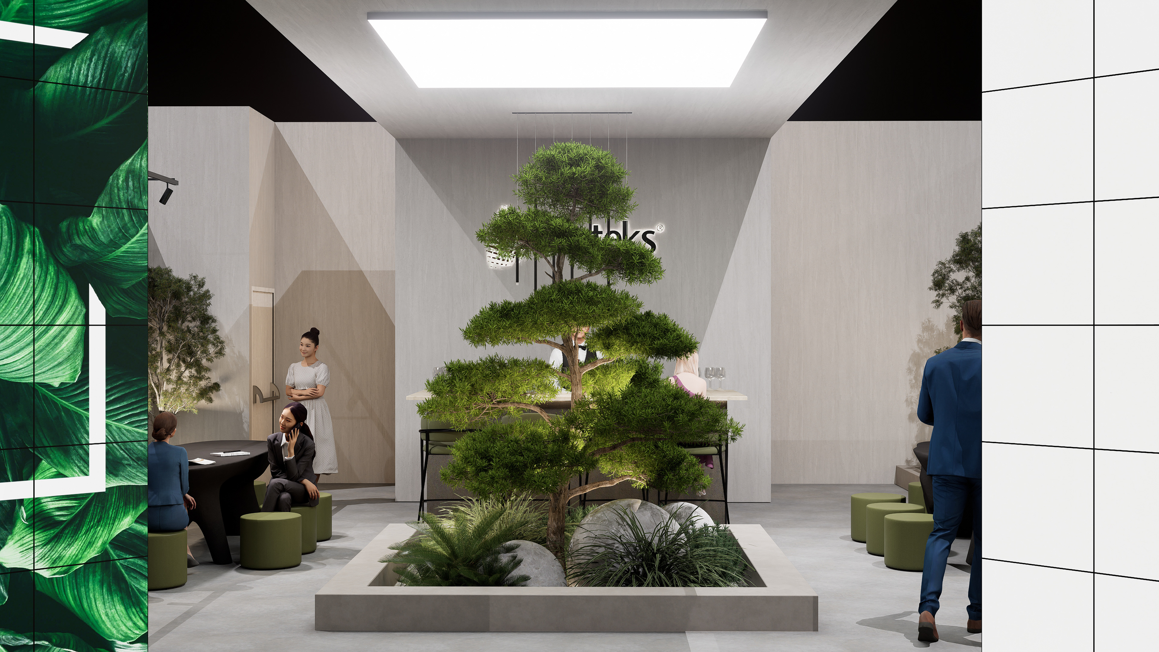 Stone, earth-toned, and matte concrete textures used on the floor and surfaces bring a sense of natural warmth and a timeless character to the stand. Matte finishes combined with varying shades of green and a soft natural lighting effect create a calm, peaceful, and inviting atmosphere. Dark wooden tabletops introduce warmth and elegance, while green-toned upholstery in the seating areas reflects nature’s color palette.