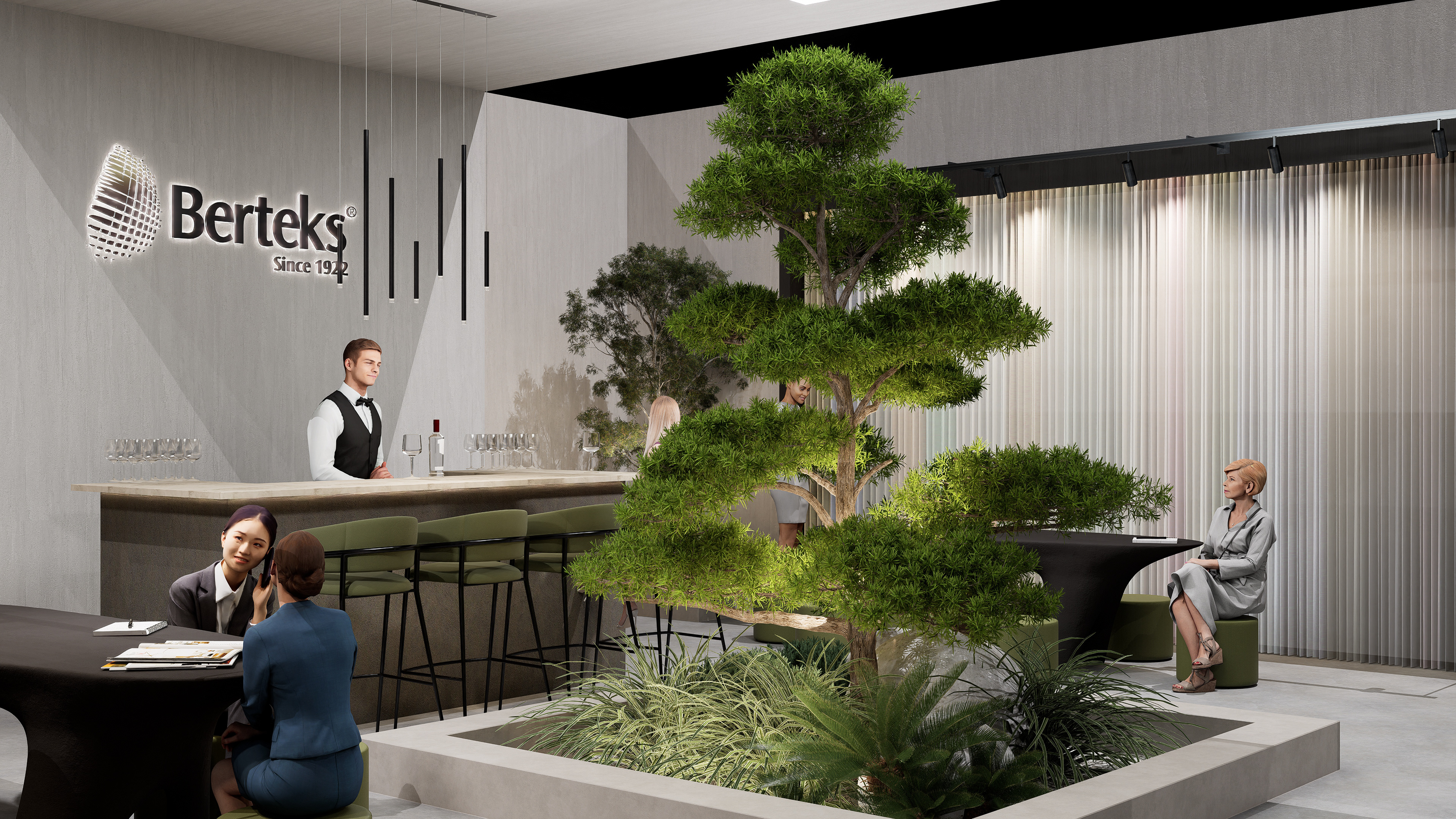 The central tree and surrounding natural plants add vitality and freshness, establishing a direct emotional connection with visitors. All material and color selections are guided by principles of harmony with nature, simplicity, and balance. This design transforms the concept of “life born from nature,” inherent in textiles, into a spatial experience, expressing Berteks’ natural, strong, and timeless brand identity.
