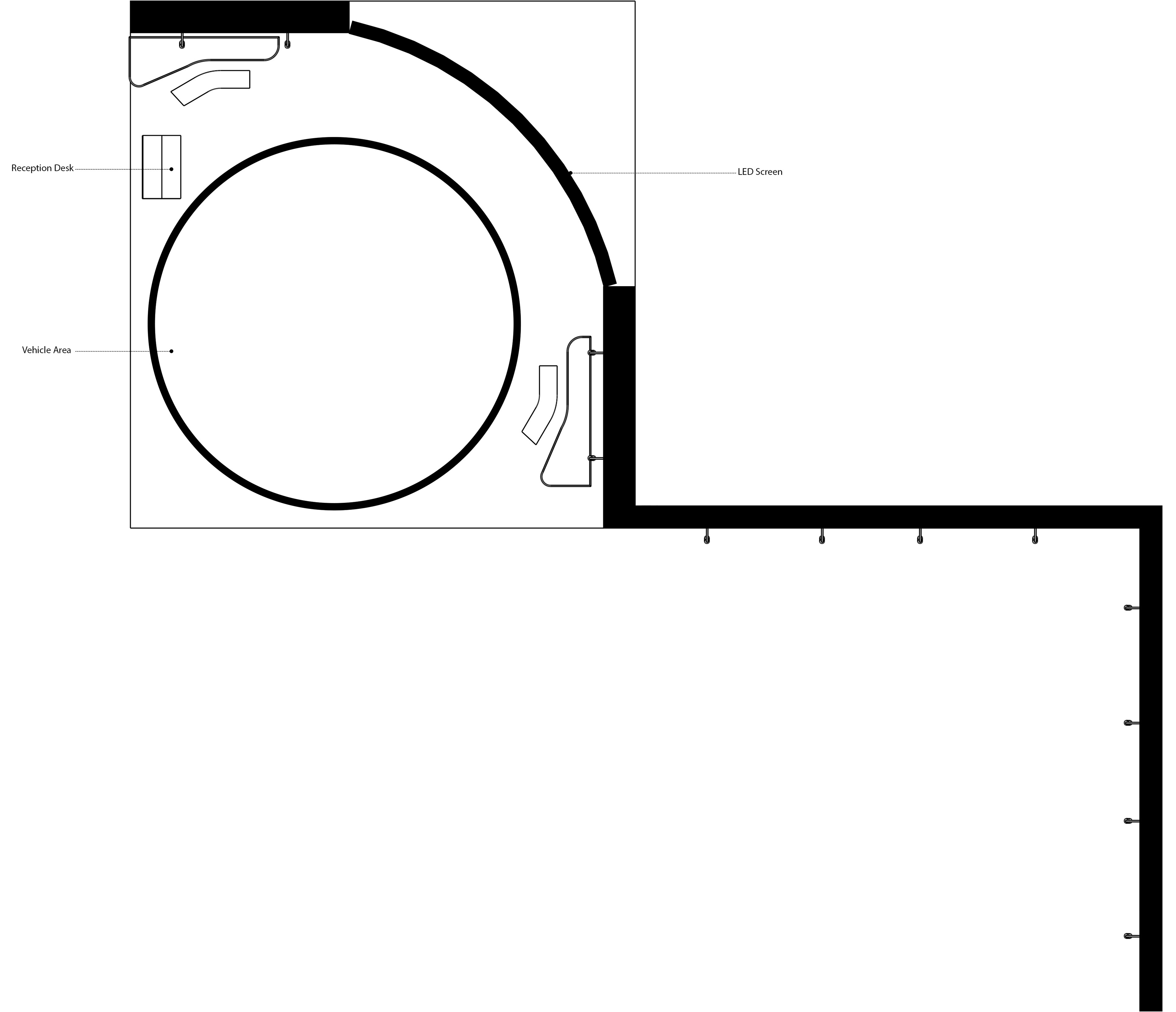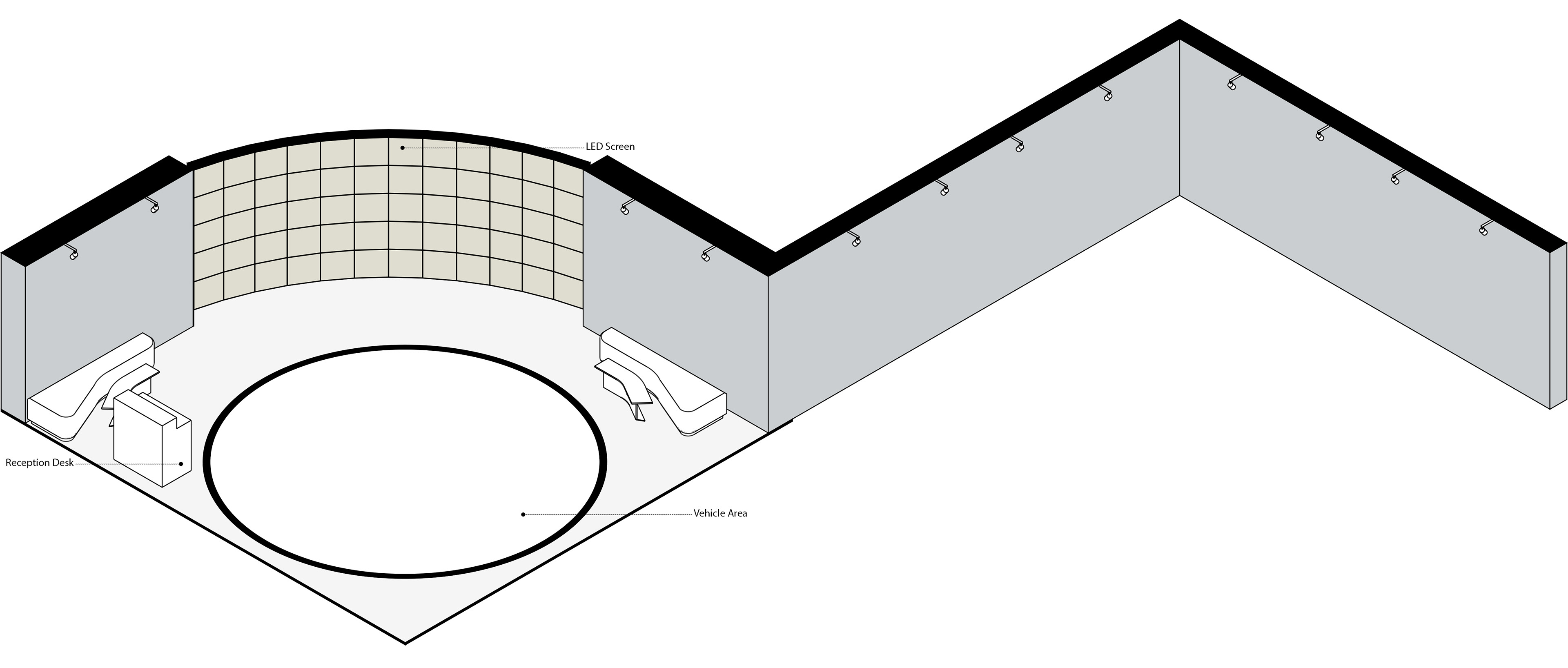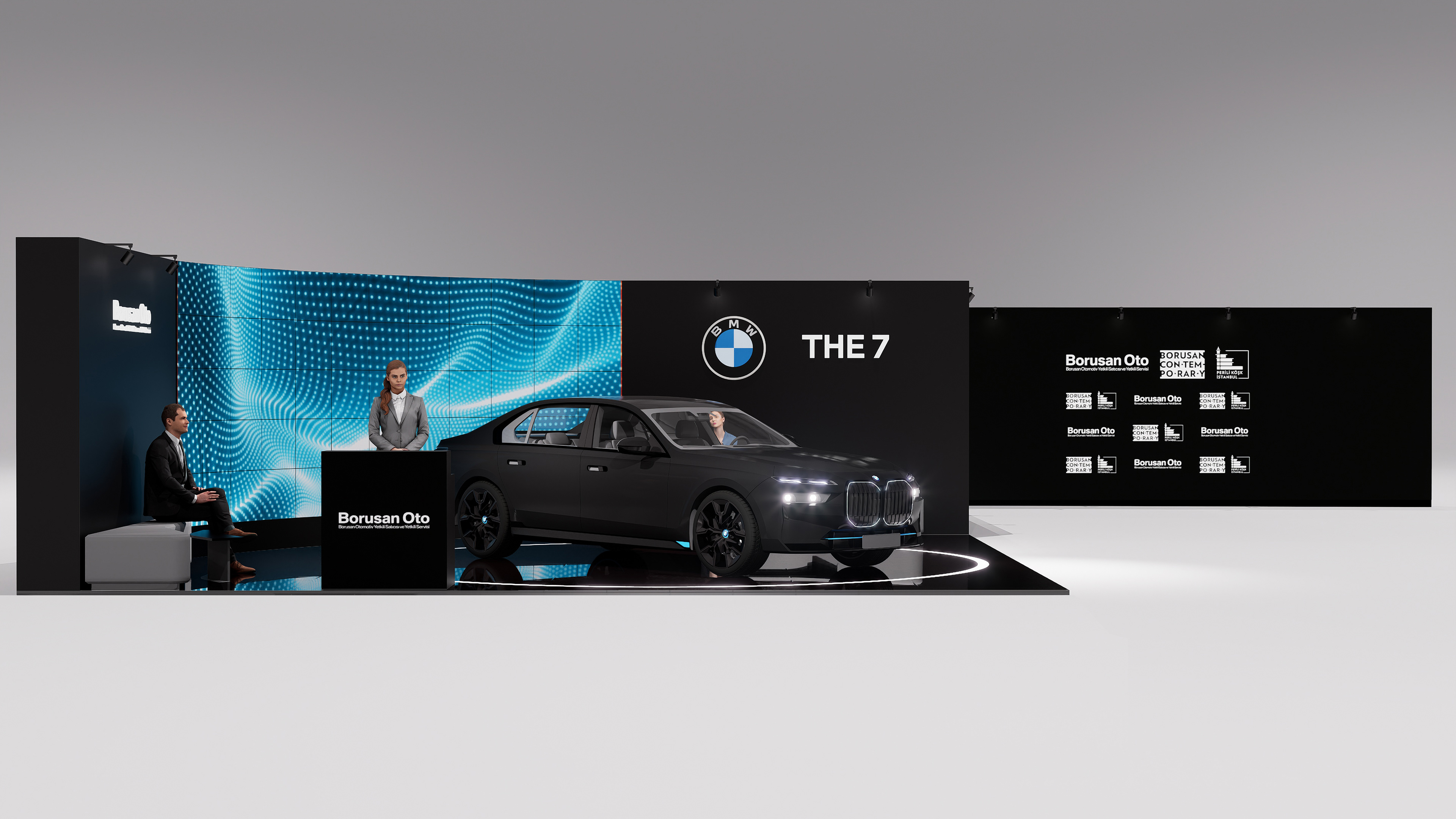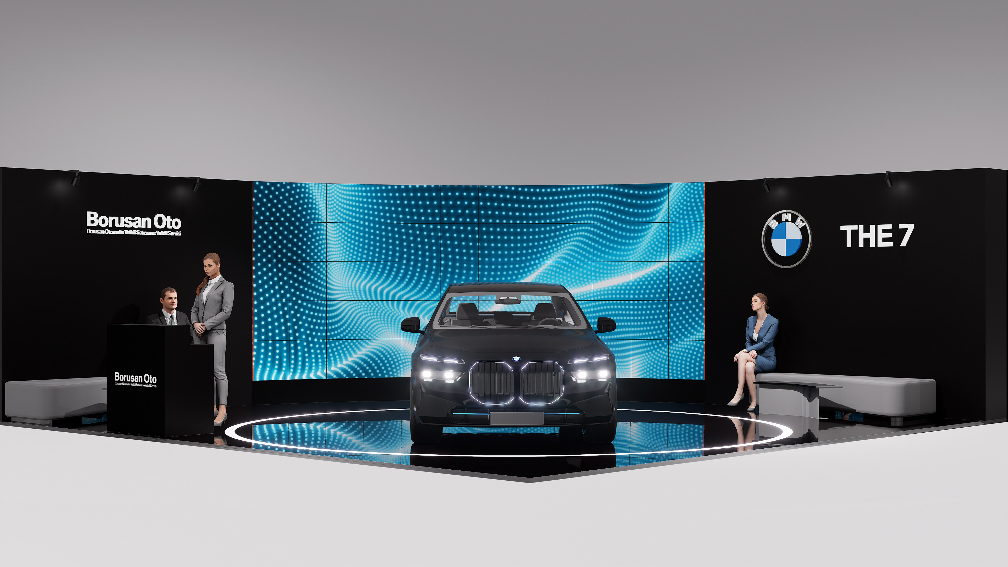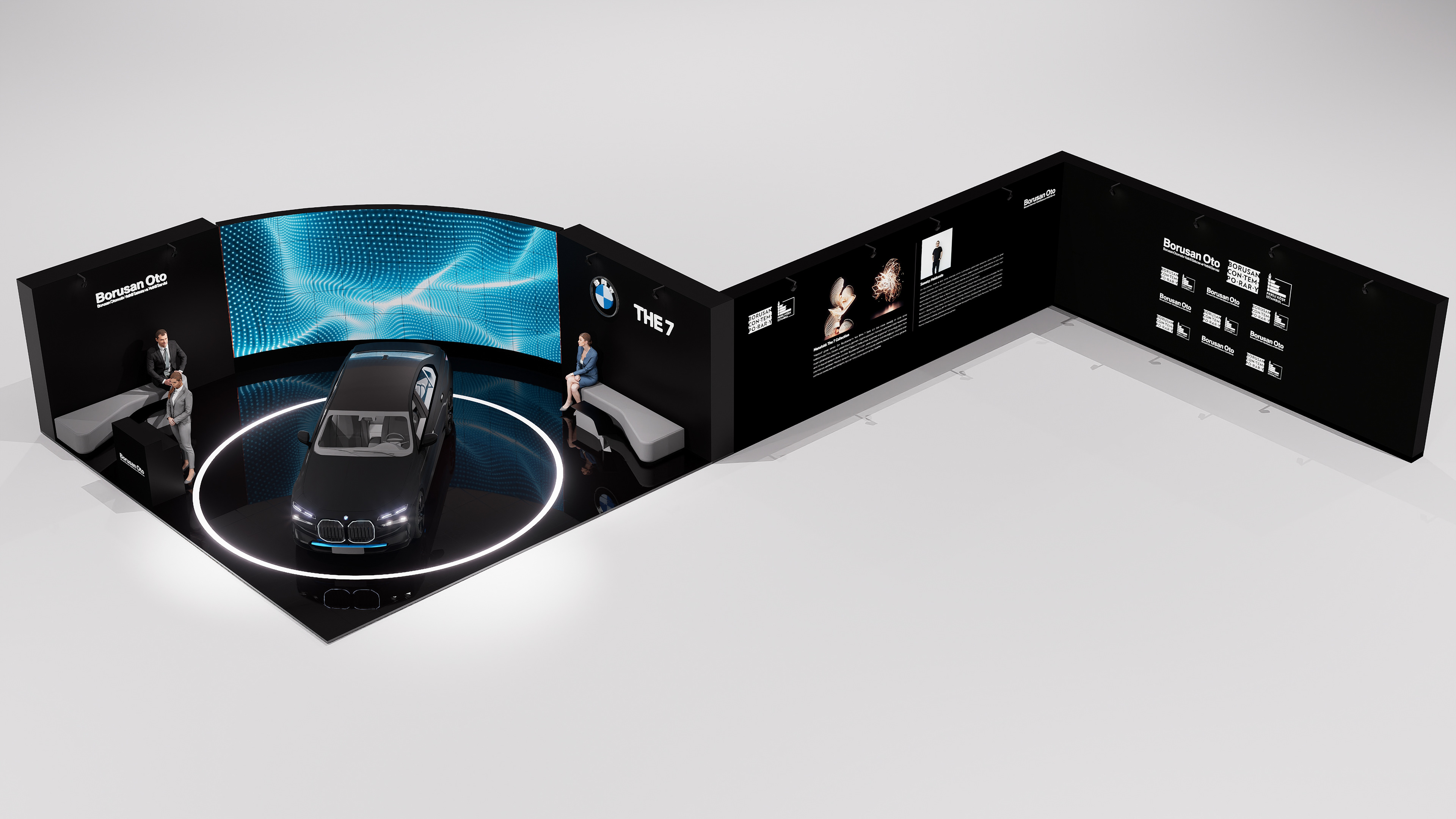 The space is defined by a circular layout surrounding the centrally positioned BMW 7 Series, complemented by a semi-enclosed backdrop composed of high-resolution digital screens. The screen surfaces displaying kinetic digital sculptures create a visual frame that emphasizes the sculptural form of the vehicle, while the glossy black floor and reflective surfaces enhance the interaction between digital content and the physical object. The exhibition space offers a contemporary and immersive experience where digital art, automotive design, and architectural space converge.