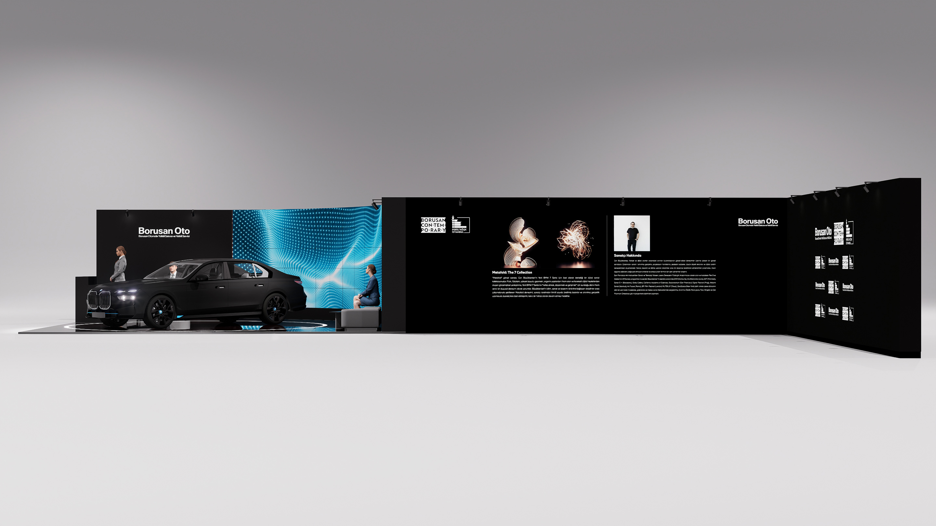The exhibition space for Metafold, a digital art collection created by Can Büyükberber for the New BMW 7 Series, was designed for the 11th ArtAnkara International Contemporary Art Fair. The design is based on a holistic spatial concept that brings together the digital art installation and the physical presence of the BMW 7 Series within a single central composition.