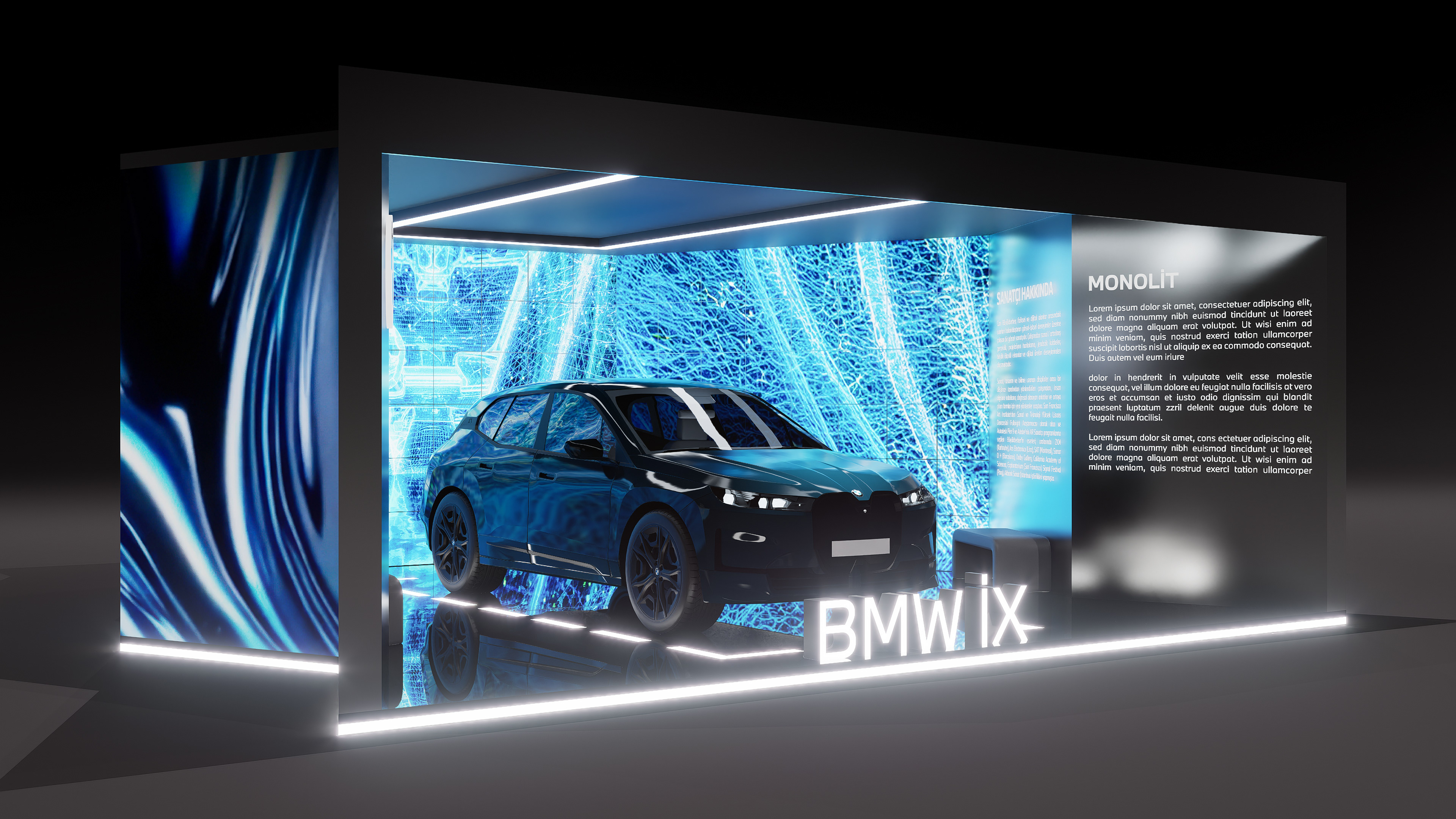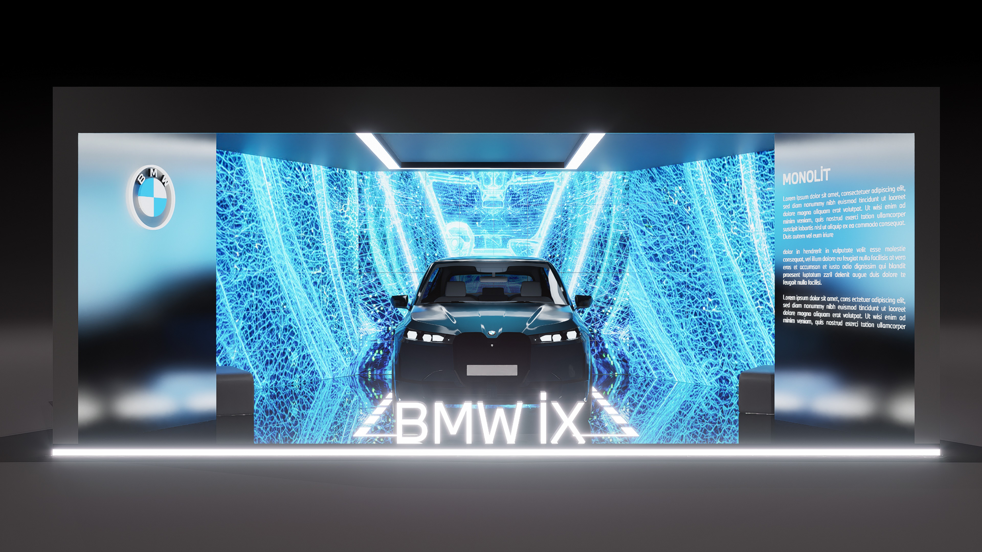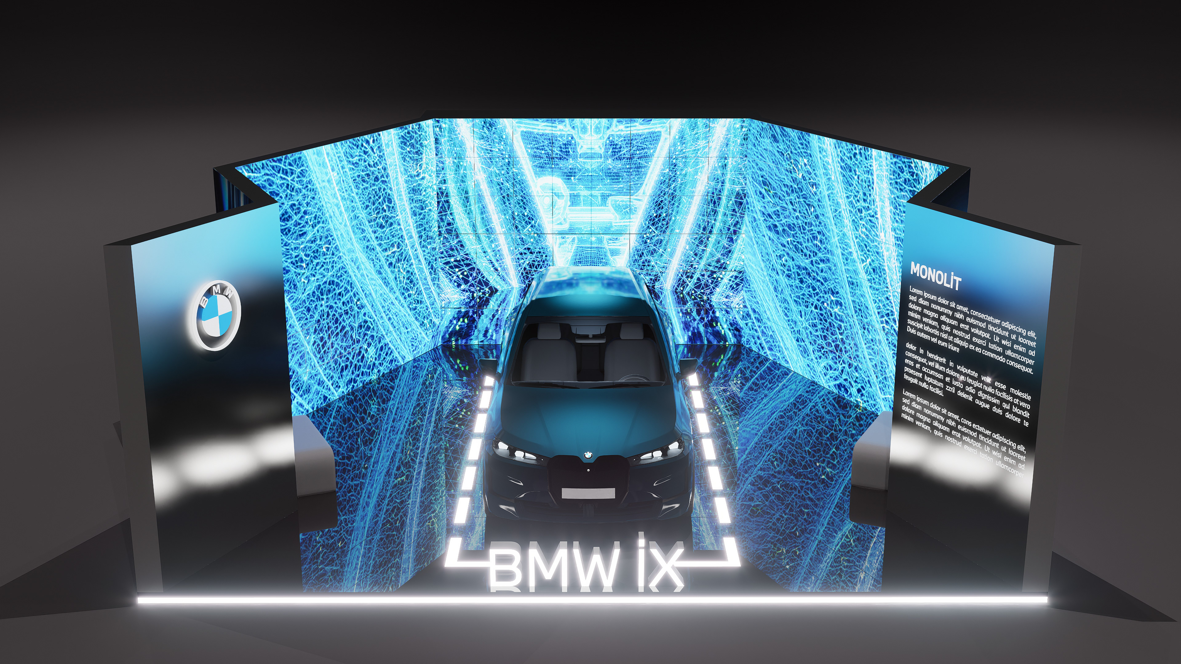 The exhibition space for MONOLiT, a visual and auditory experience created by Can Büyükberber for the new BMW iX, was designed as an immersive spatial environment.