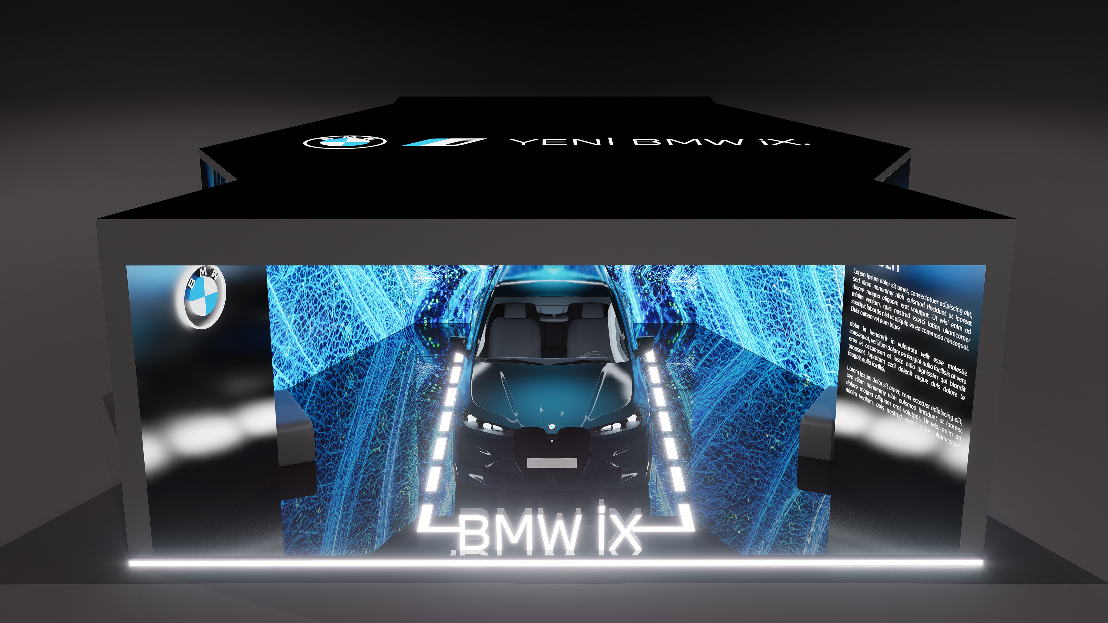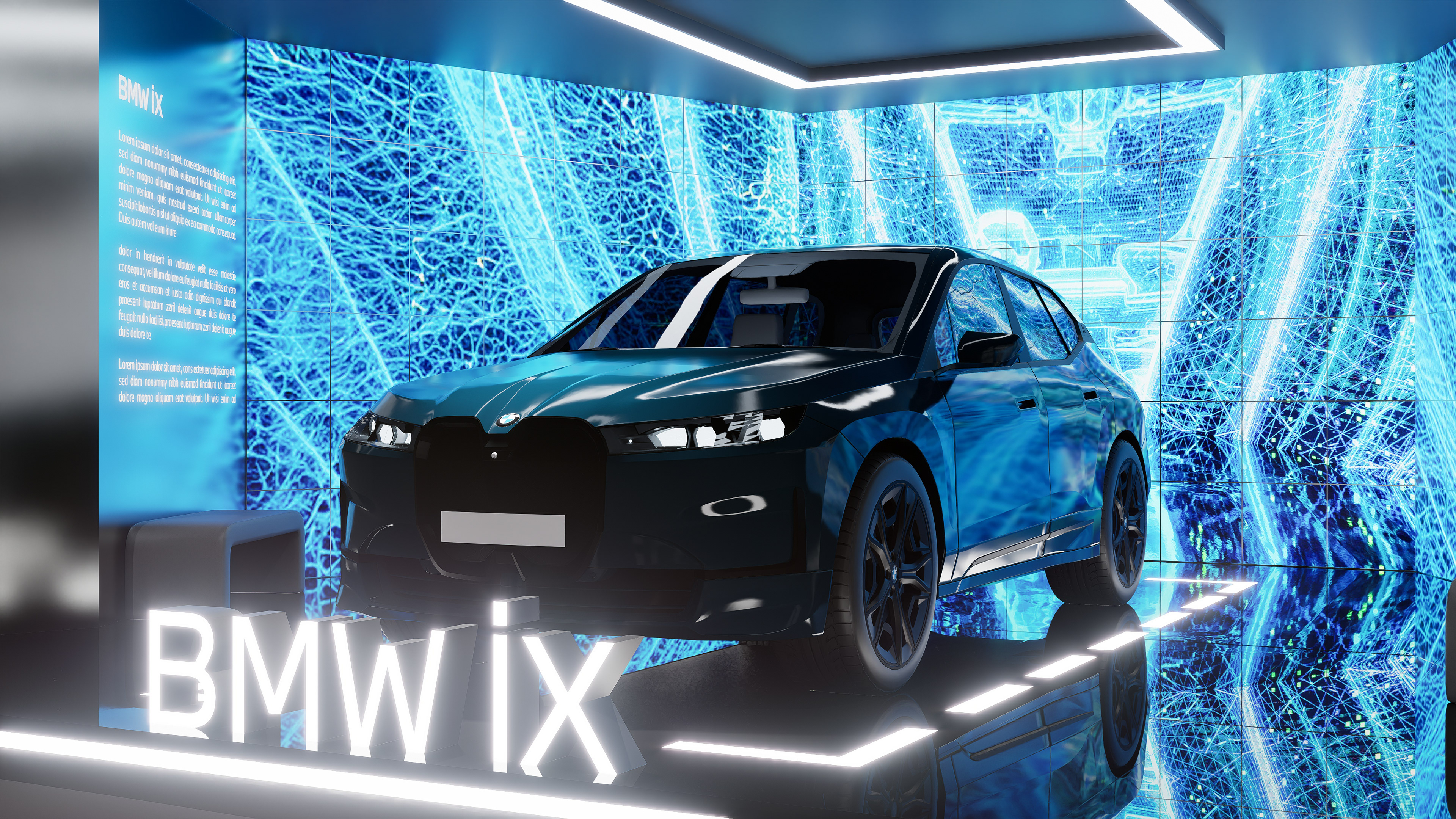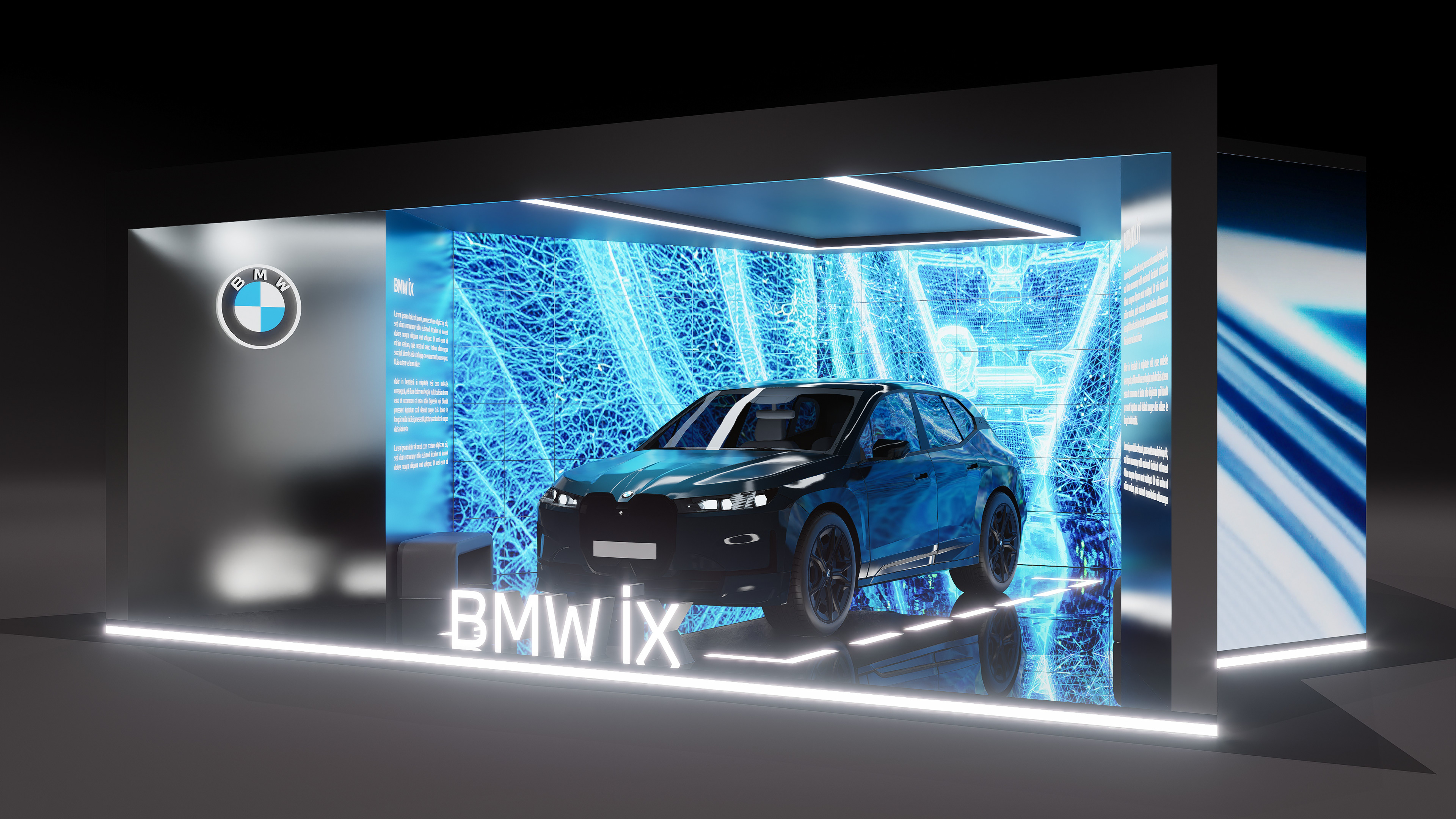 The space is composed of a semi-enclosed volume defined by high-resolution digital surfaces and light elements, surrounding the centrally positioned BMW iX. The fluid, network-inspired visual language displayed on the digital screens translates the vehicle’s technological infrastructure and electric energy into a spatial metaphor, establishing a seamless relationship between the automobile and the digital content.