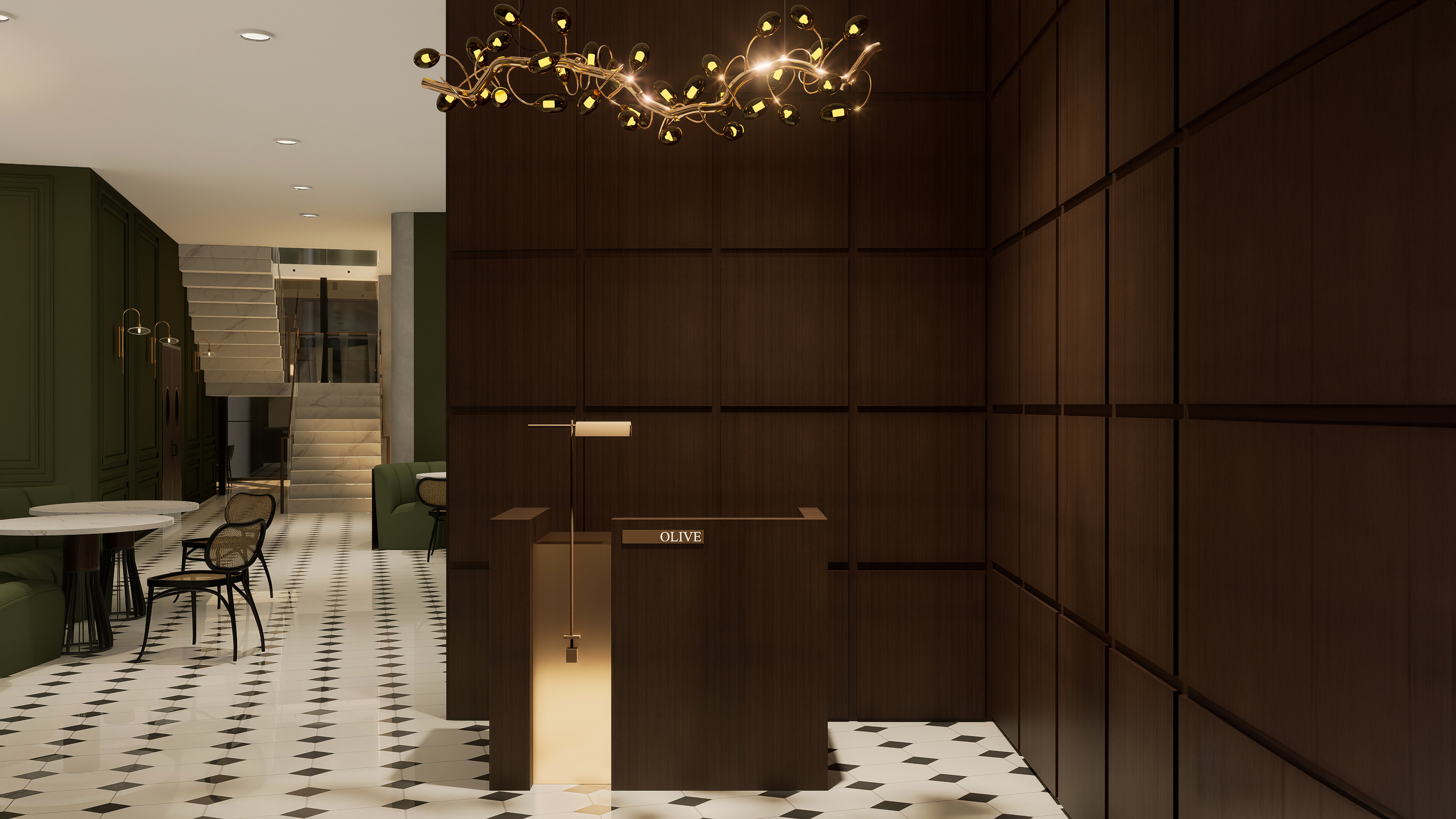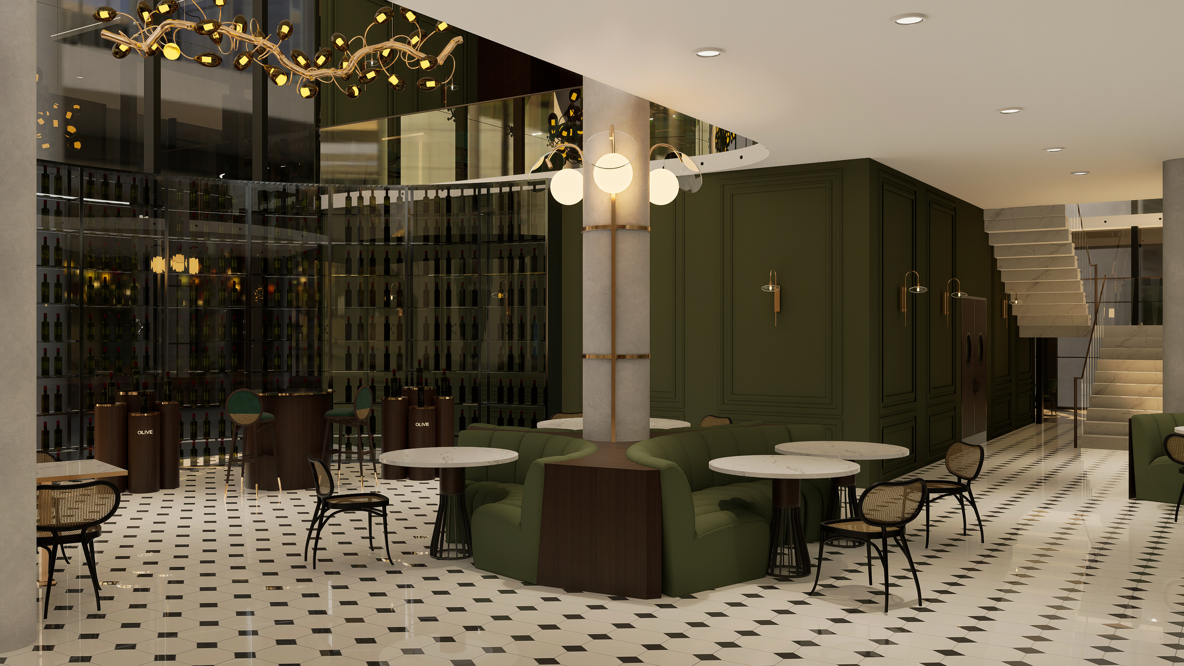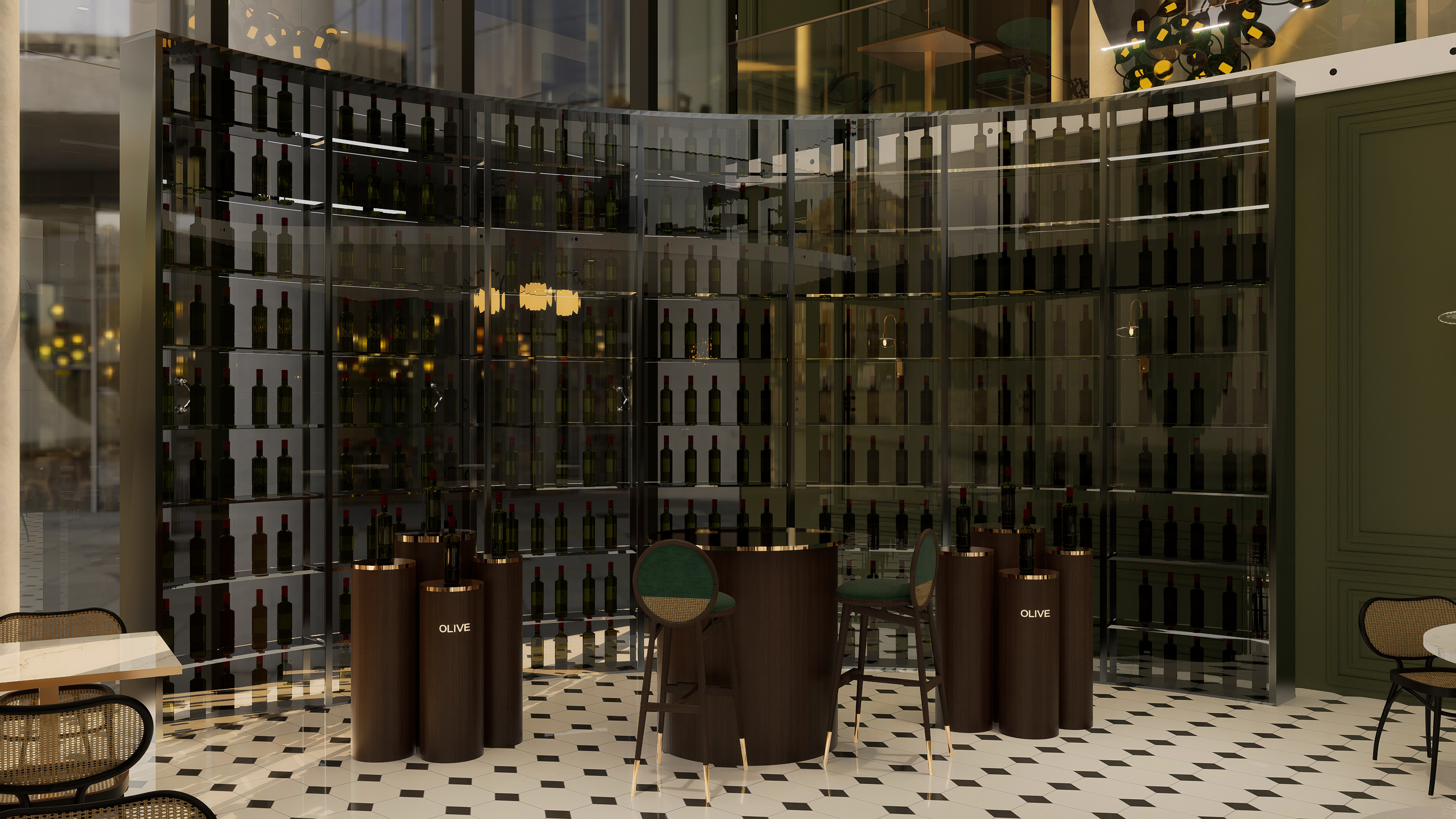The restaurant integrates a gastronomic concept, based on olive oils sourced from the Kalamata region of Greece, into its spatial design. The interior features wood paneling and rich green tones, creating a natural atmosphere. A black and white geometrically patterned marble floor lends the space a classic and timeless character. The seating areas feature rounded banquettes, rattan-decorated chairs, and marble-topped tables, creating a modern interpretation that evokes the Mediterranean spirit. The gallery space, the design's primary focal point, provides visual dominance to the olive oil tasting area. Surrounded by glass, bottles of olive oil selected from various regions of the world are displayed on shelving systems, supported by wooden cylindrical tasting units, which serve as an experiential center. Organically shaped pendant lights and gold-toned accents enhance the emphasis on the bottles and the overall atmosphere of the space. The venue combines weekly tavern nights, which require reservations, with live music and a special tasting menu, transforming gastronomy and spatial design into a holistic experience.