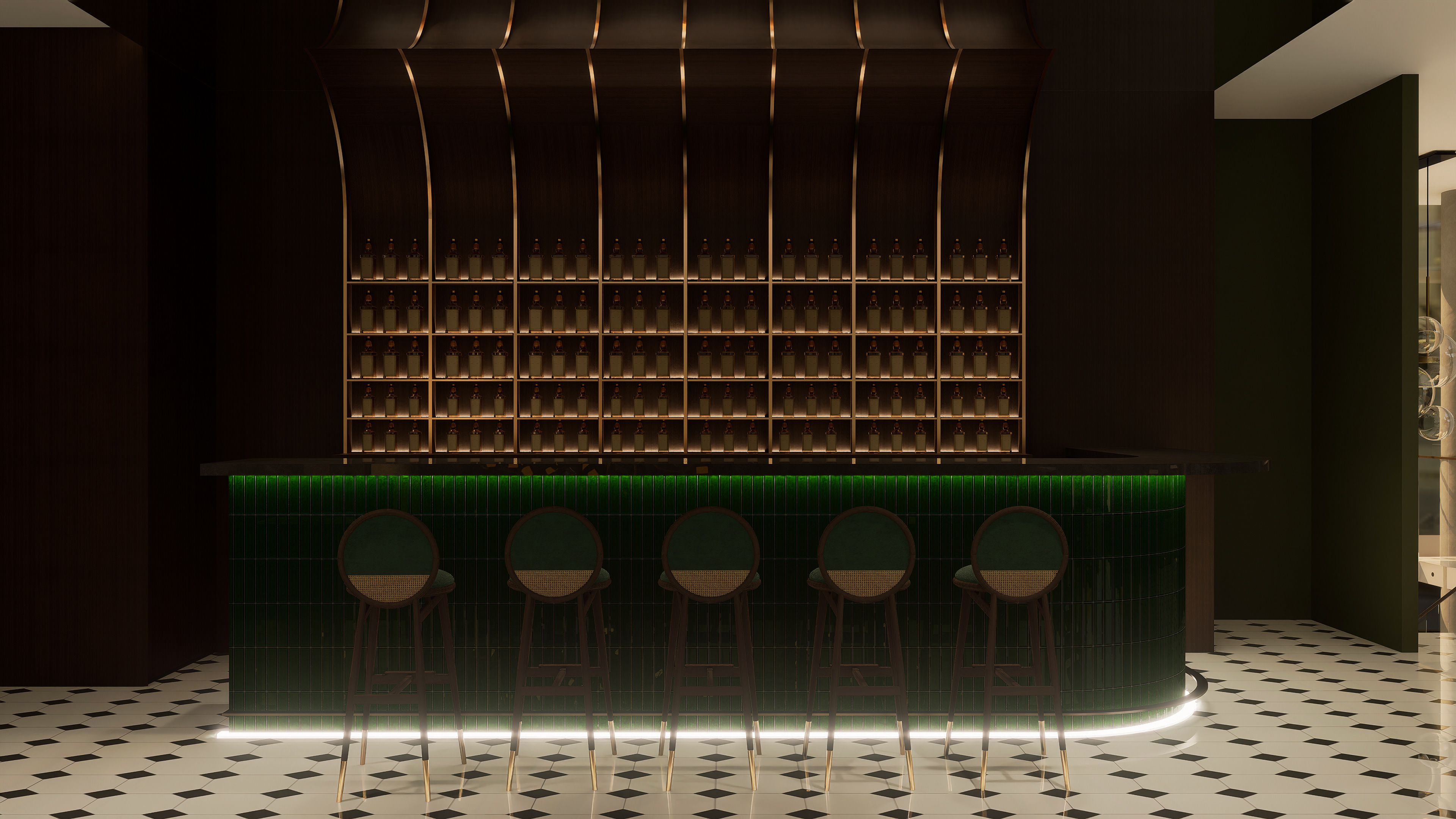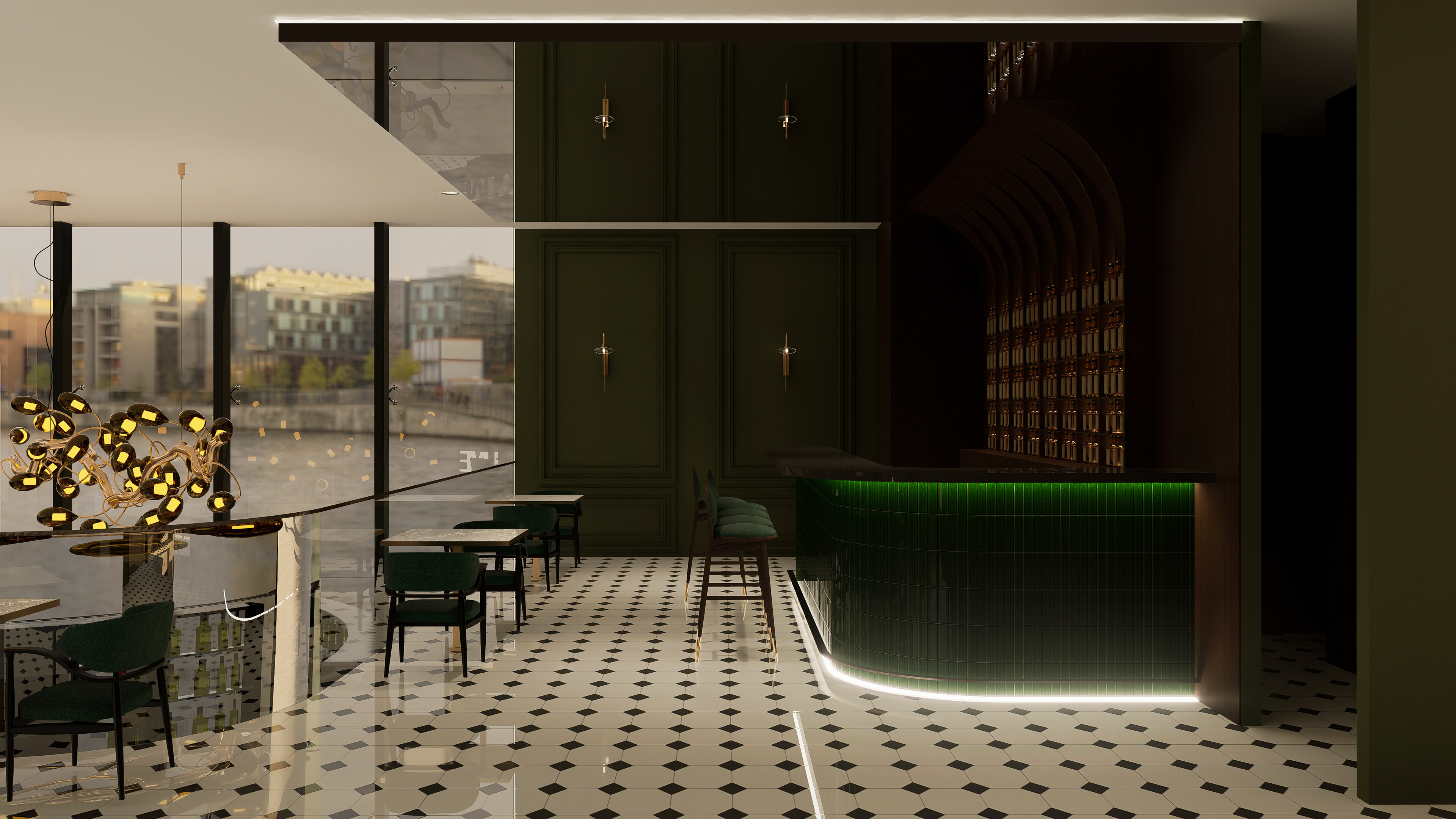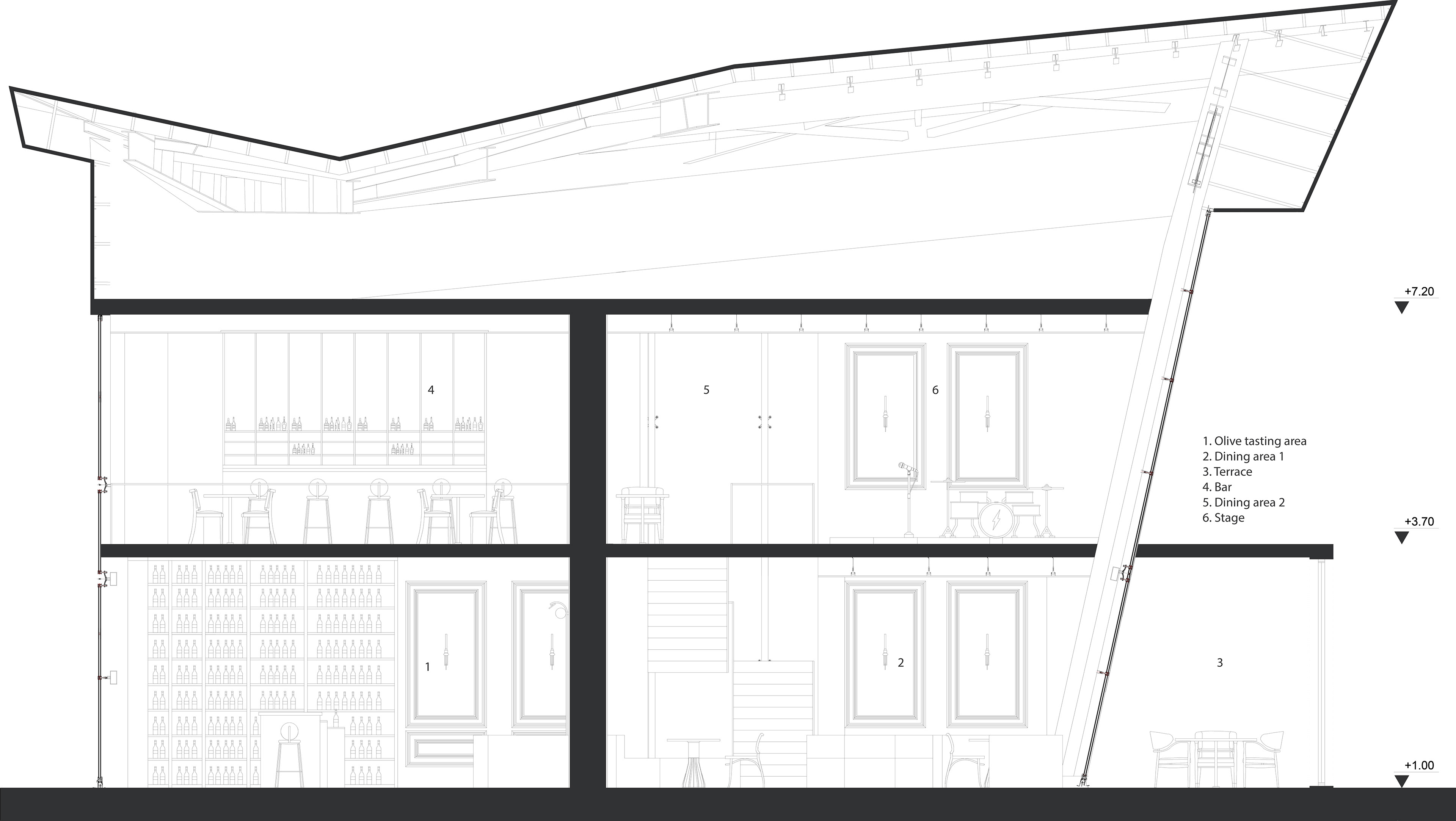 The restaurant integrates a gastronomic concept, based on olive oils sourced from the Kalamata region of Greece, into its spatial design. The interior features wood paneling and rich green tones, creating a natural atmosphere. A black and white geometrically patterned marble floor lends the space a classic and timeless character. The seating areas feature rounded banquettes, rattan-decorated chairs, and marble-topped tables, creating a modern interpretation that evokes the Mediterranean spirit. The gallery space, the design's primary focal point, provides visual dominance to the olive oil tasting area. Surrounded by glass, bottles of olive oil selected from various regions of the world are displayed on shelving systems, supported by wooden cylindrical tasting units, which serve as an experiential center. Organically shaped pendant lights and gold-toned accents enhance the emphasis on the bottles and the overall atmosphere of the space. The venue combines weekly tavern nights, which require reservations, with live music and a special tasting menu, transforming gastronomy and spatial design into a holistic experience.
