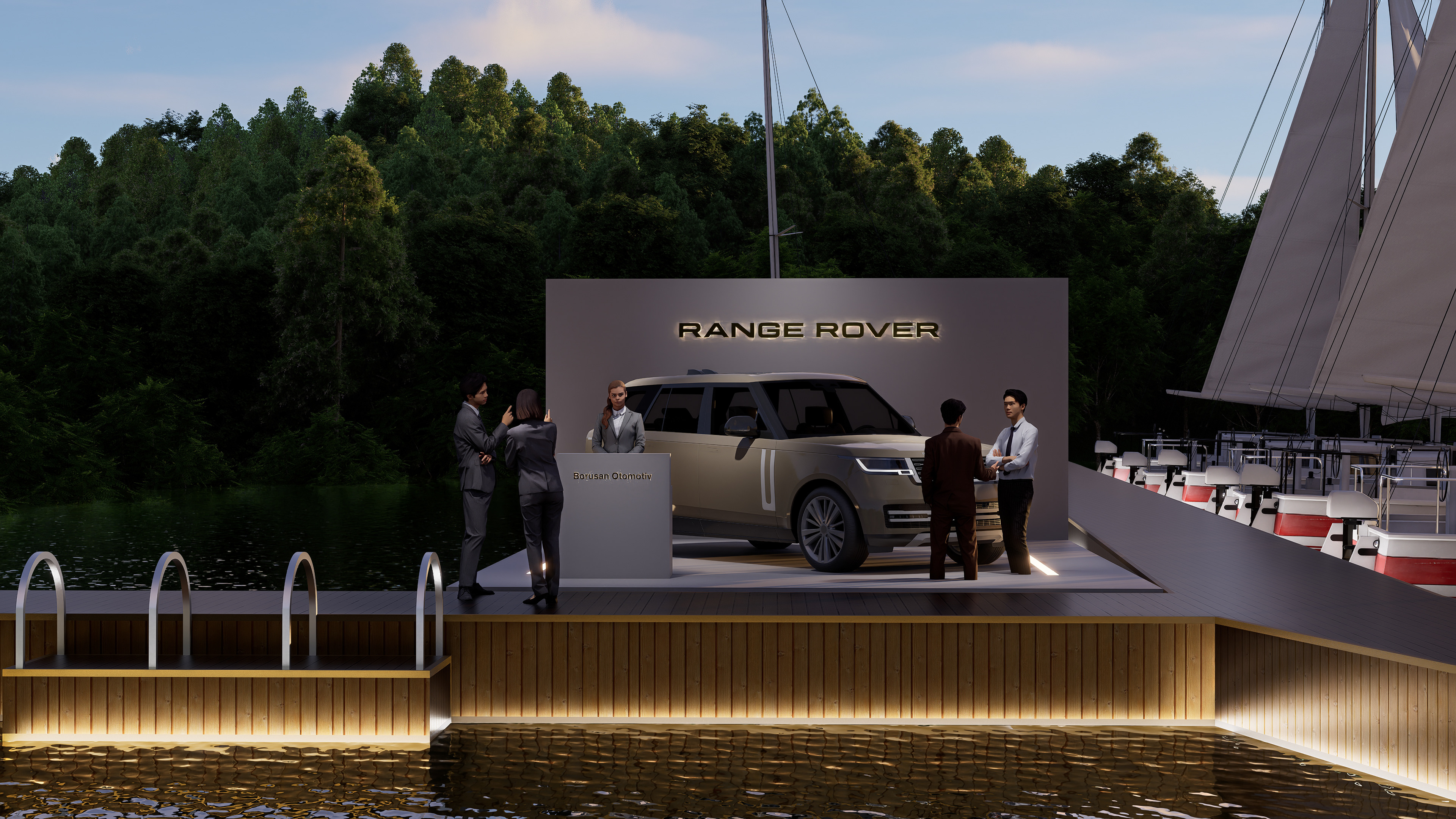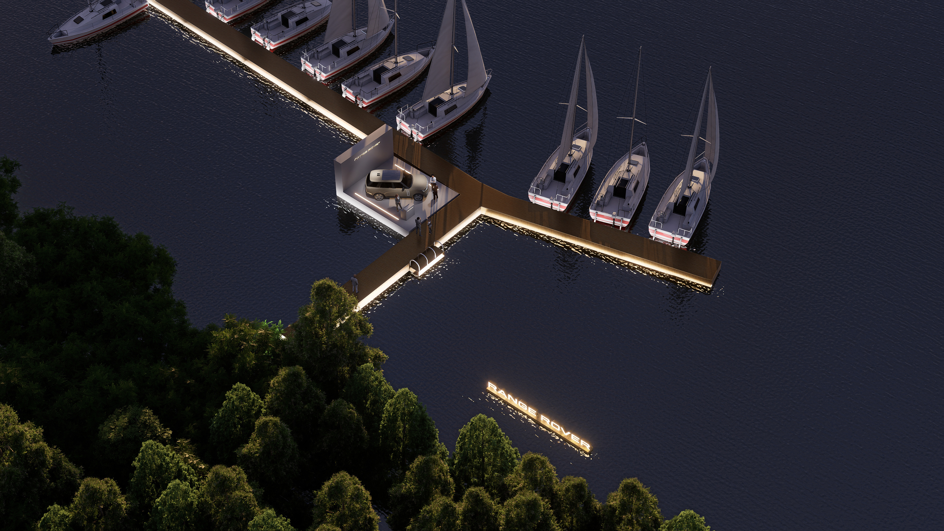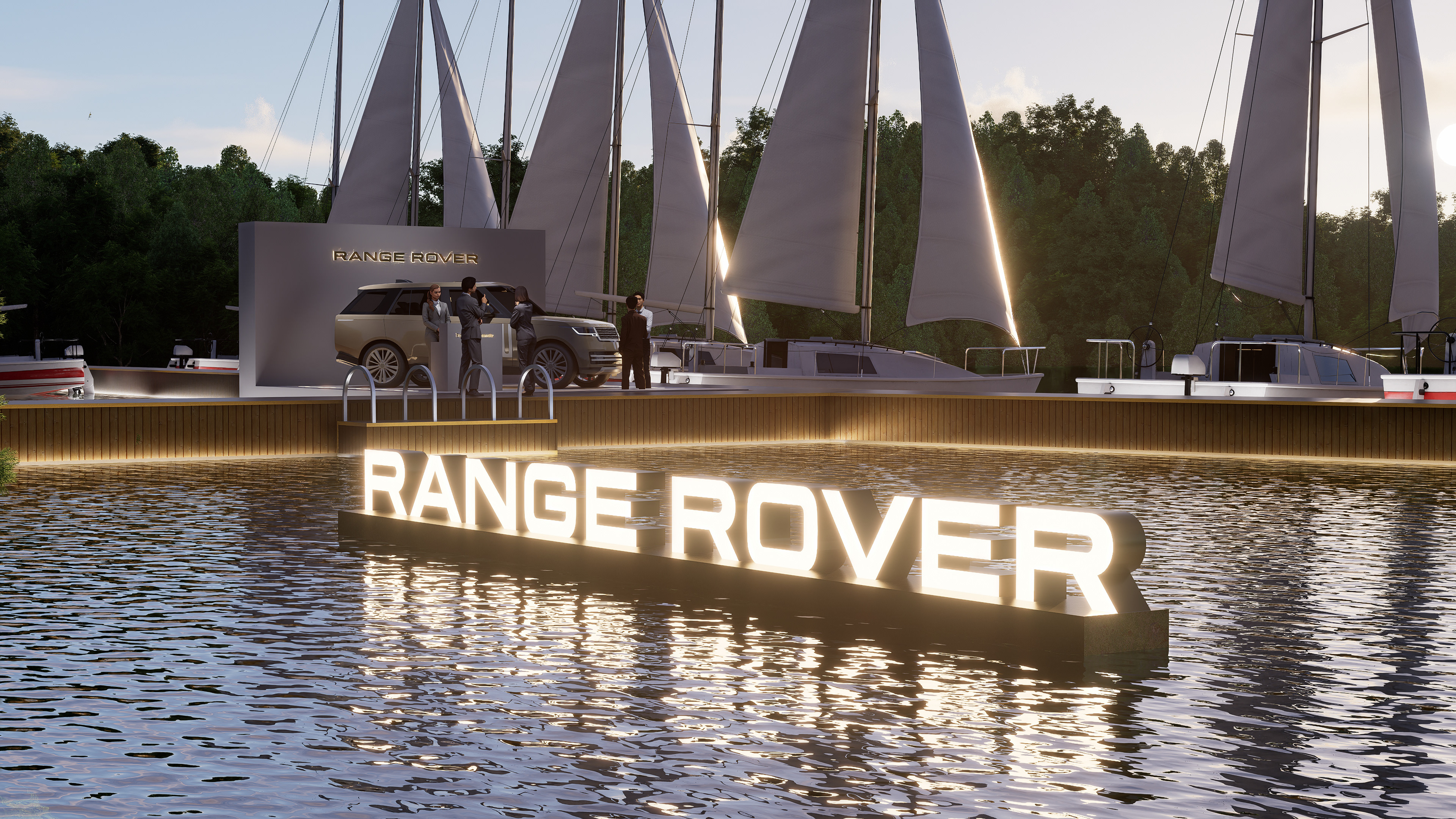 One of the key focal elements of the stand is the illuminated Range Rover lettering positioned on the water. Rather than functioning solely as a logo, this element acts as a spatial anchor that defines the presence of the brand within the marina. At night, the illuminated lettering reflects on the water surface, enhancing visibility and creating a strong, memorable silhouette that becomes a signature landmark within its surroundings.