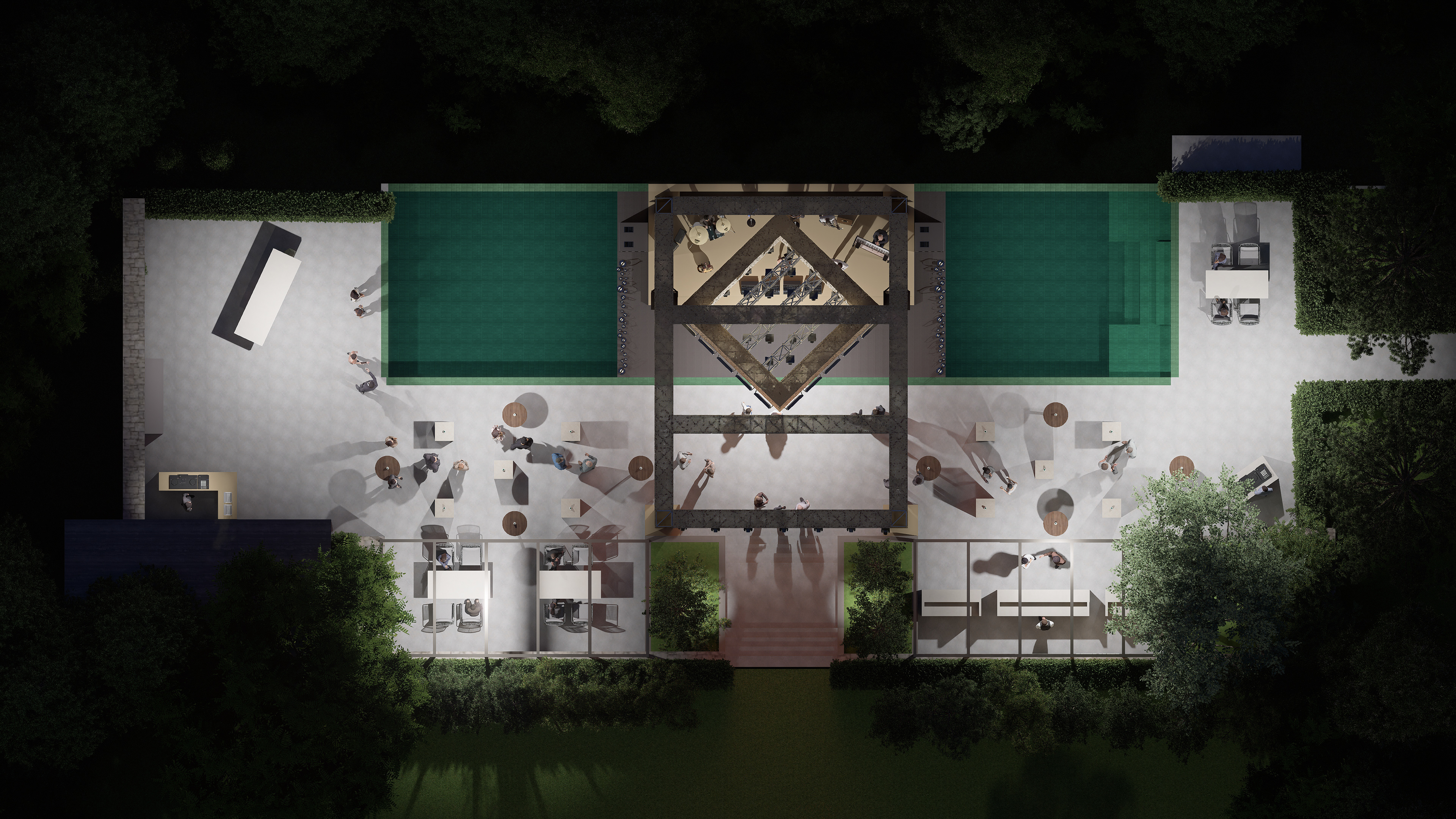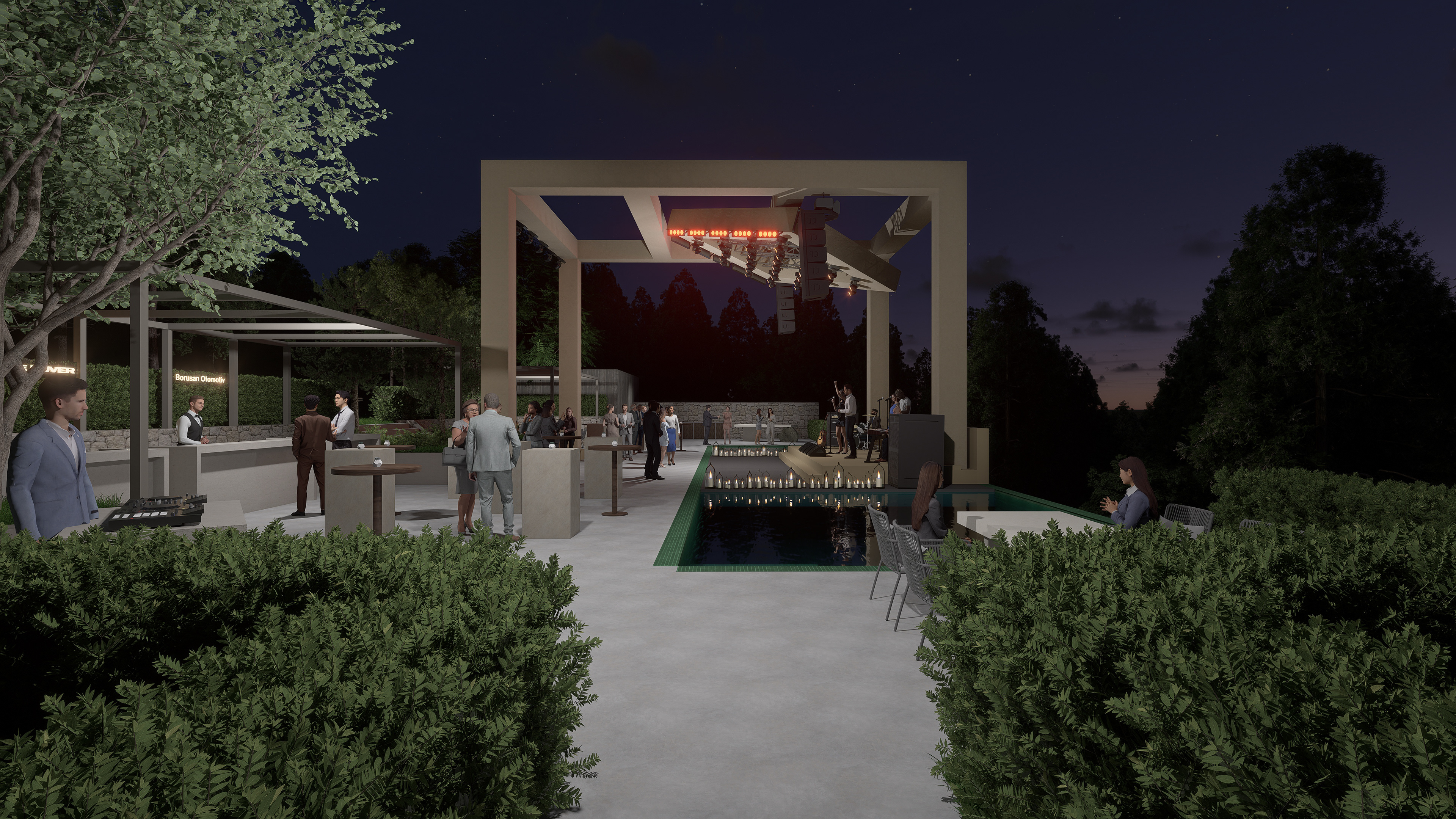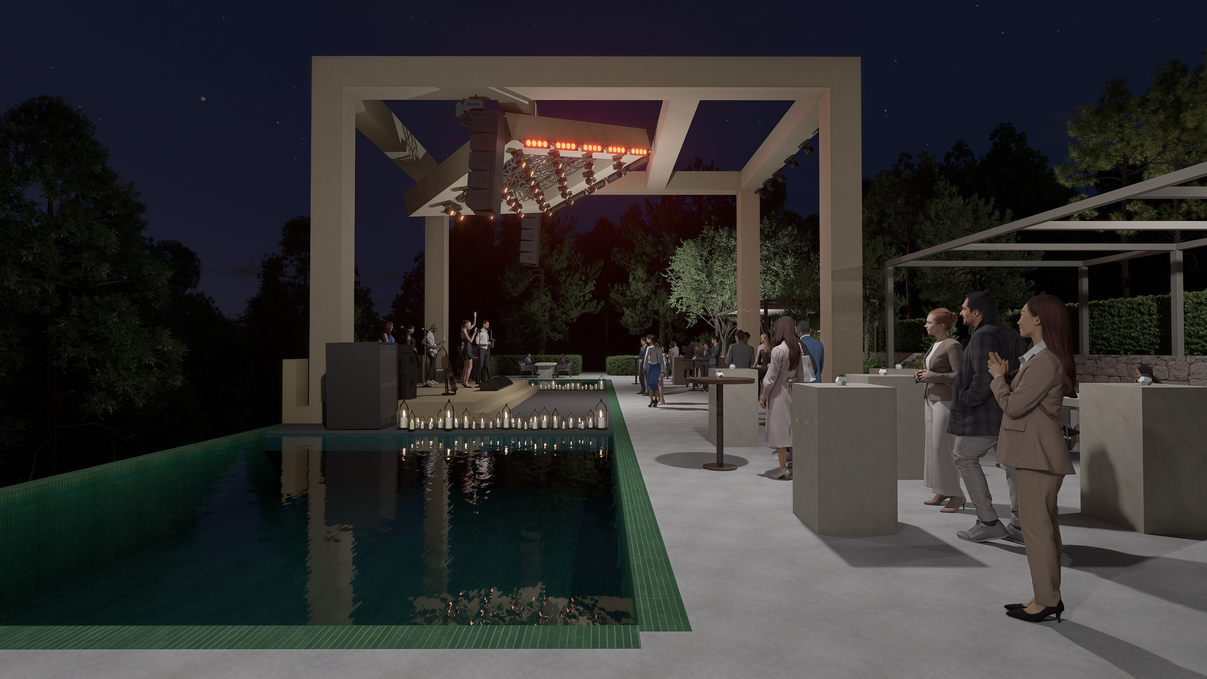 The event area is composed of a stage positioned over the pool and surrounding bistro areas. The water surface provides a strong backdrop for the stage, enhancing reflections and deepening the spatial perception during nighttime use. The stage structure utilizes truss systems clad with light-toned (beige/sand-colored) fabric, softening the technical appearance and transforming it into a more refined and architectural expression. This approach reinforces the stage’s luxurious and minimal character while maintaining harmony with the natural surroundings.