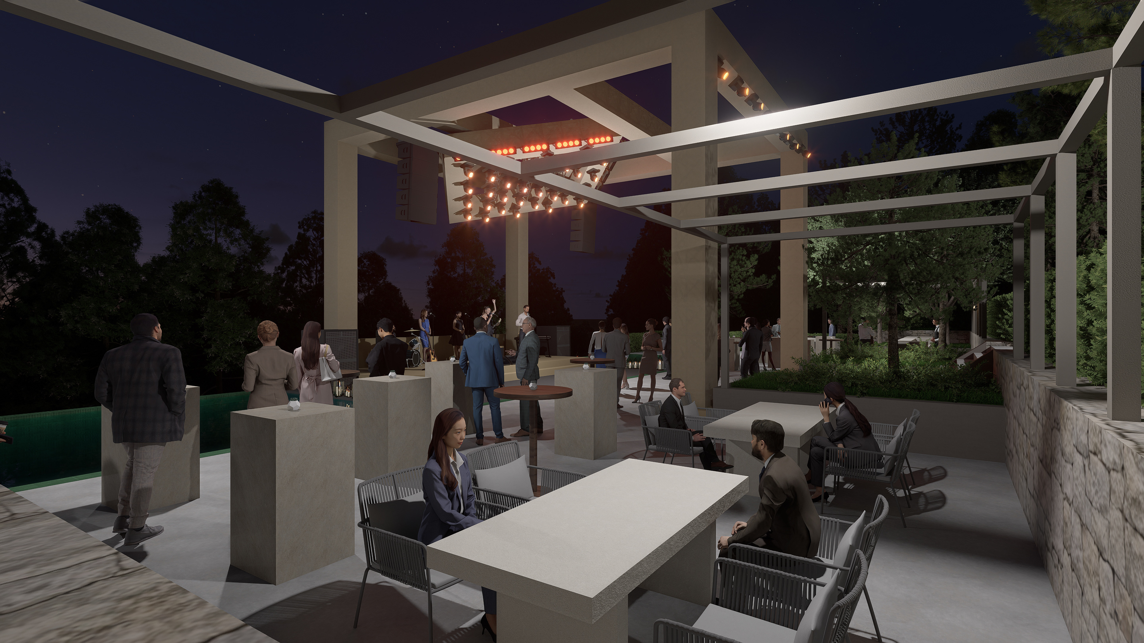 The bistro areas are arranged to encourage social interaction and fluid movement throughout the space. Integrated with the natural landscape, these zones create a relaxed yet elegant atmosphere. The lighting design emphasizes the stage with warm-toned illumination, while ambient lighting throughout the venue establishes an inviting and premium nighttime experience.